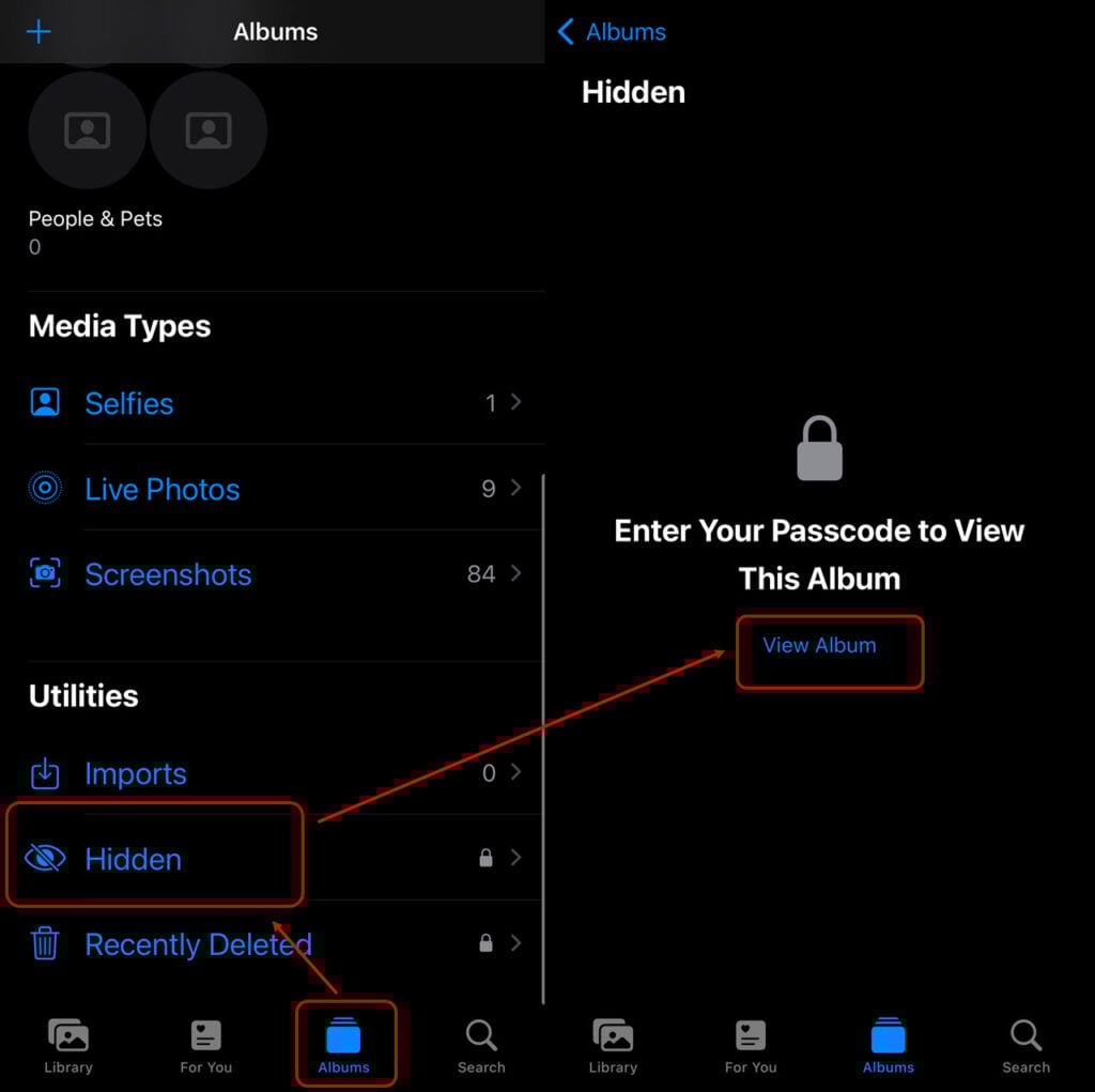 - Open Photos and then tap on Album at the bottom. Enter your iPhone’s passcode.